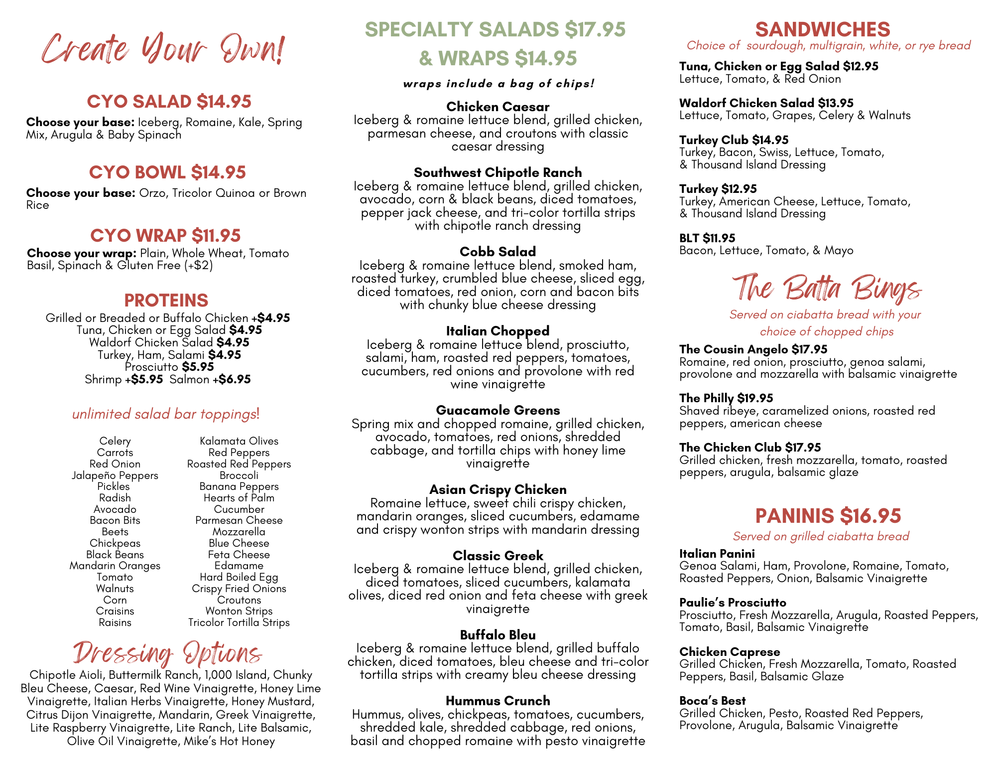 We know that no two cravings are the same. With our fully customizable menu, you’re in control. Choose from a variety of fresh toppings, premium proteins, and bold flavors to craft the perfect meal that suits your taste. From wraps and salads to flatbreads and more, your meal is made just the way you like it.